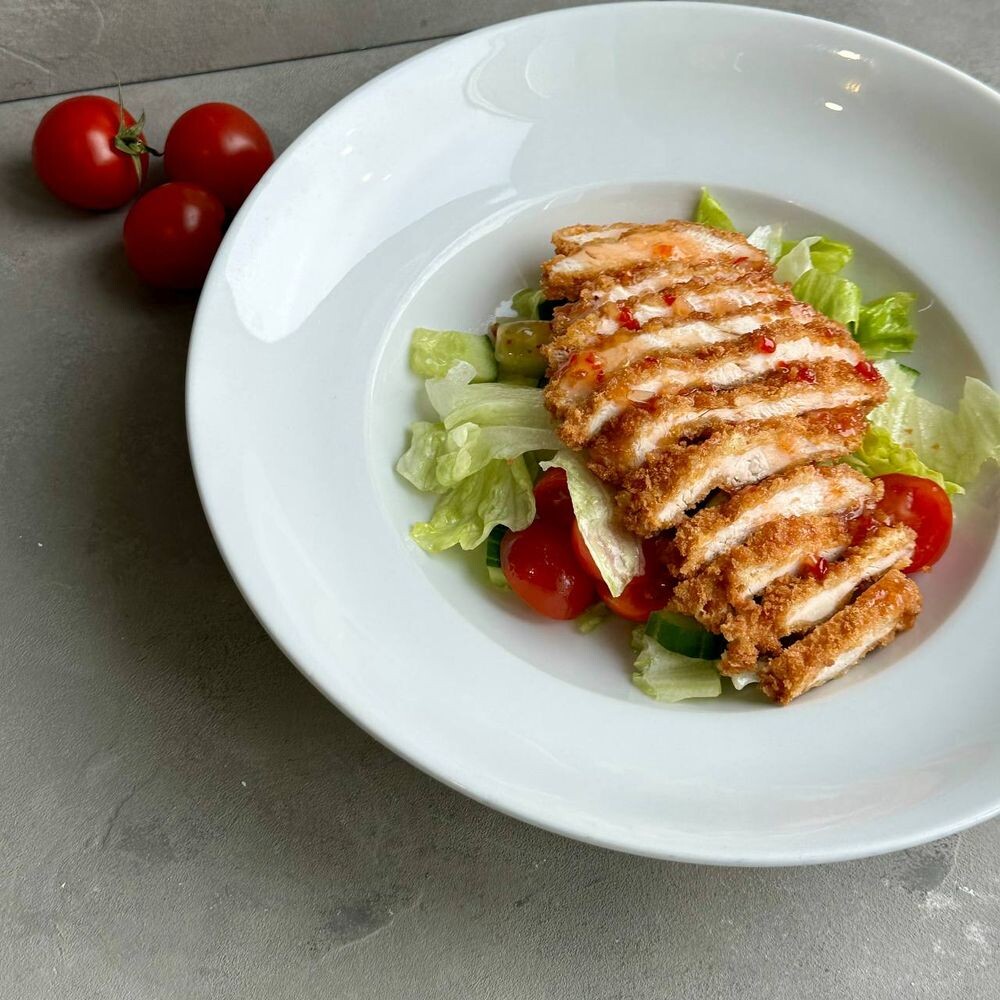 Филе куриное, салат "Айсберг",томаты черри ,огурец,соус апельсиновый,соус "Сладкий чили"